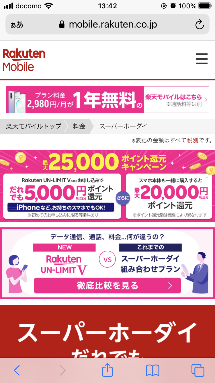 嫁はドコモから変えたくないようで、同じところにした方がなんとなくいい気がしますが、使い慣れたところから変えるのも大変ですよね。オンライン契約が主流になってきてるし、乗り換え手続きも簡単にできるようになったとは思います。Rakuten UN-LIMIT Vだとデータ1GBまで0円、Rakuten UN-LIMIT Ⅵだとどれだけ使っても2980円のプランがあります。