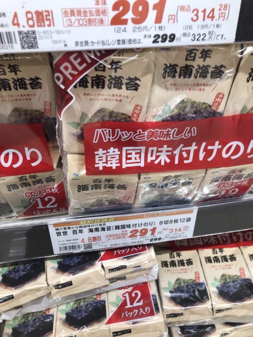 この韓国海苔はスーパーで売られていますが、全てのスーパーにはなく、置いてあるスーパーも在庫がない時がよくあります。