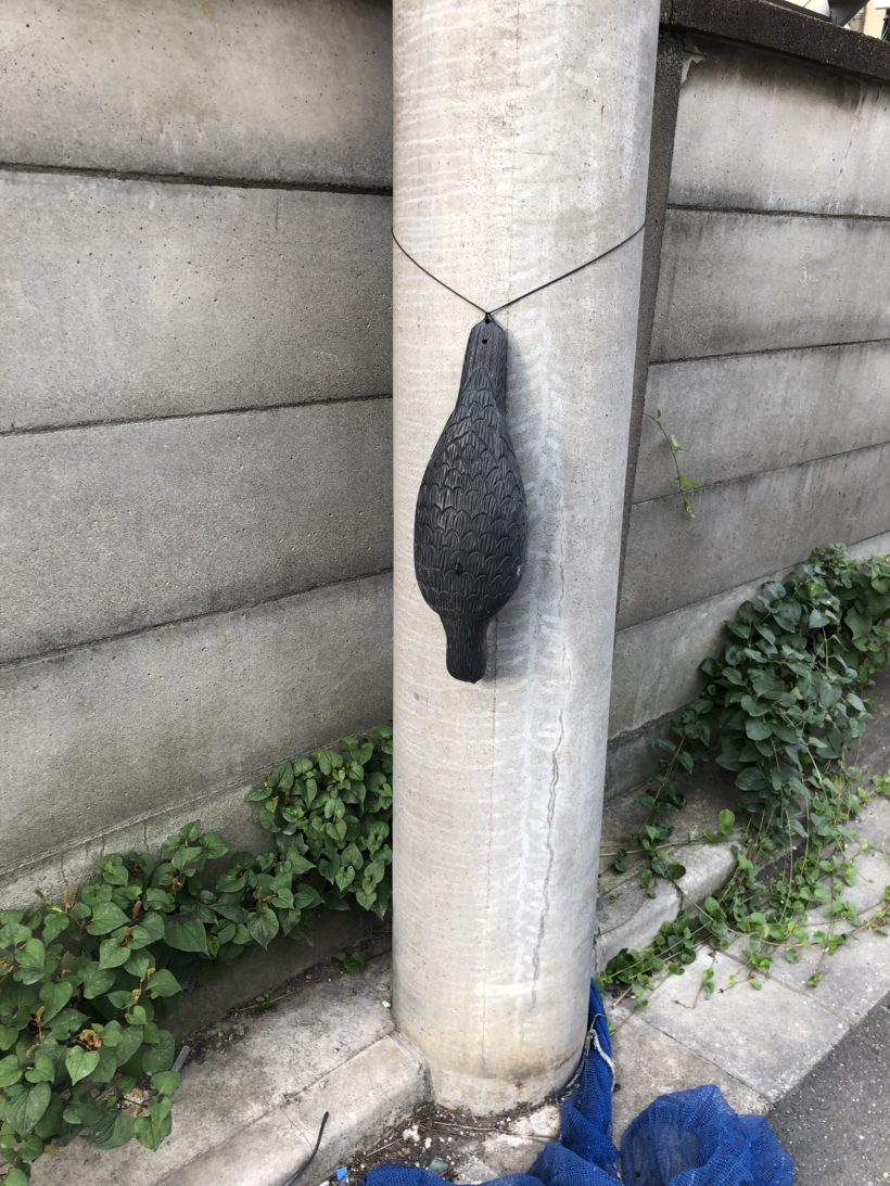 先日ジョギング中に、電信柱にカラスが逆さまに止まっているなと思い近寄ってみたら、カラスの案山子でしょうか!?
