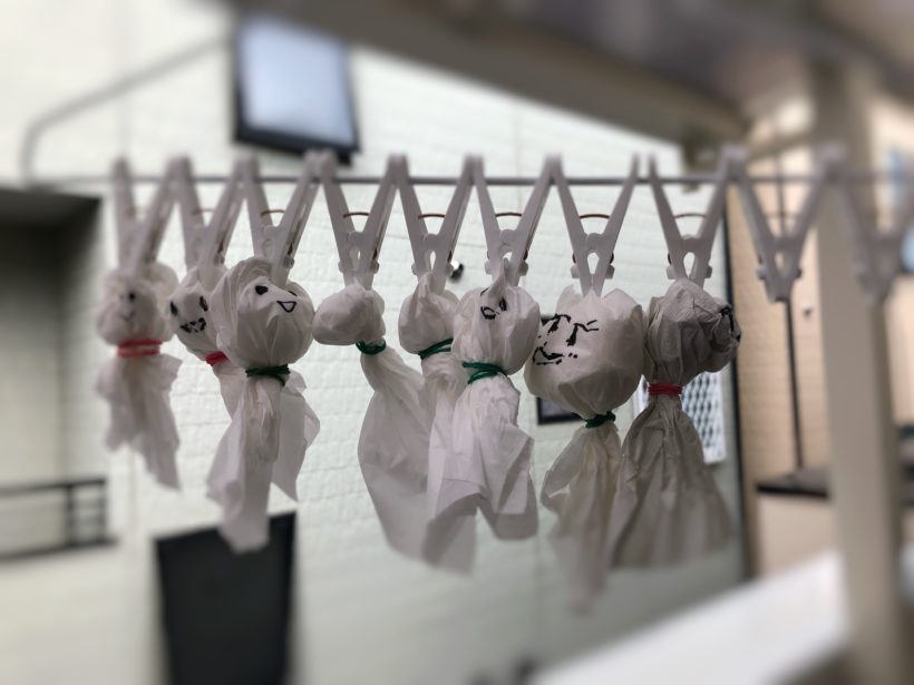 学校の校庭に集まり外で遊ぶ約束だったようで、雨だと中止だよと言ったらてるてる坊主を作り始めました。