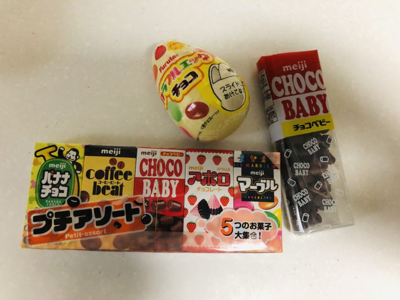 チョコはCHOCO BABYとマーブルチョコレートを買います。