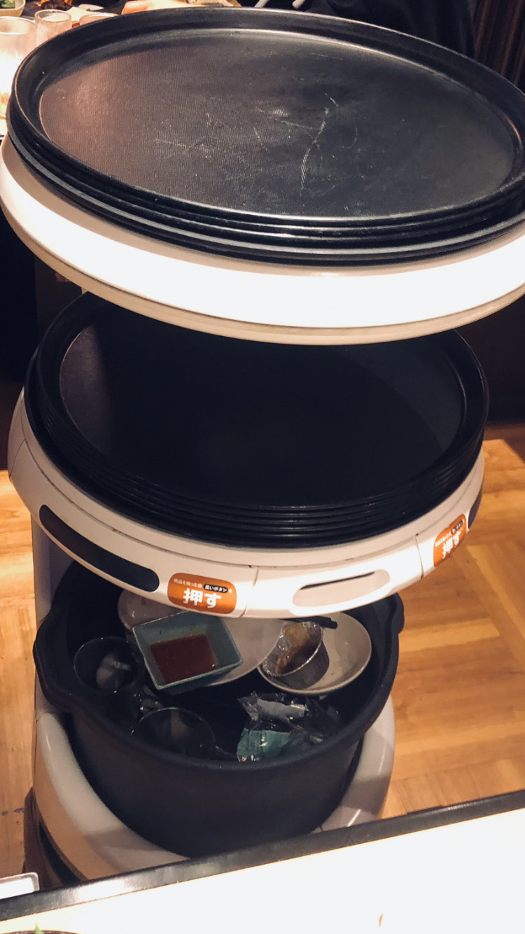 飲み物は店員さんが持ってくる場合が多いけど、肉はこの自動ロボットで届いたりします。