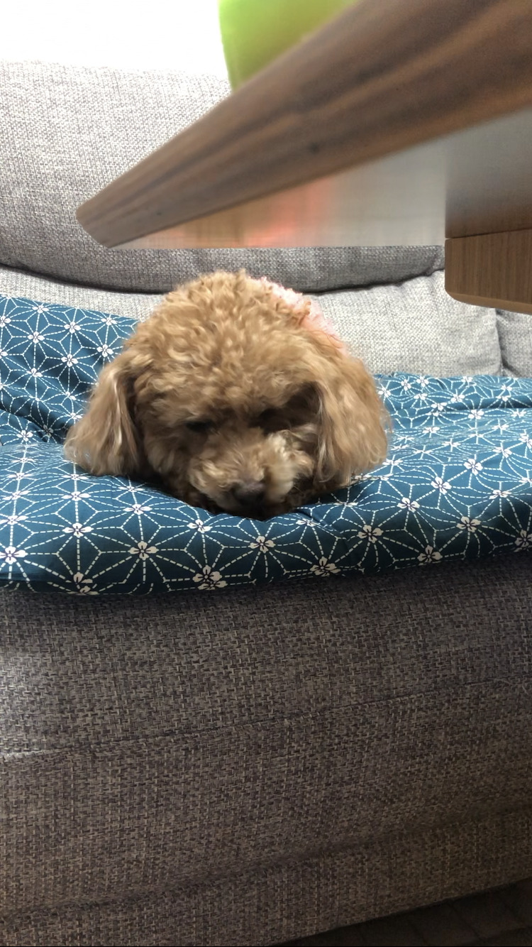 やめなさいと怒られてソファの上に座布団を置かれてすねている?ところを机の下から撮影しました。