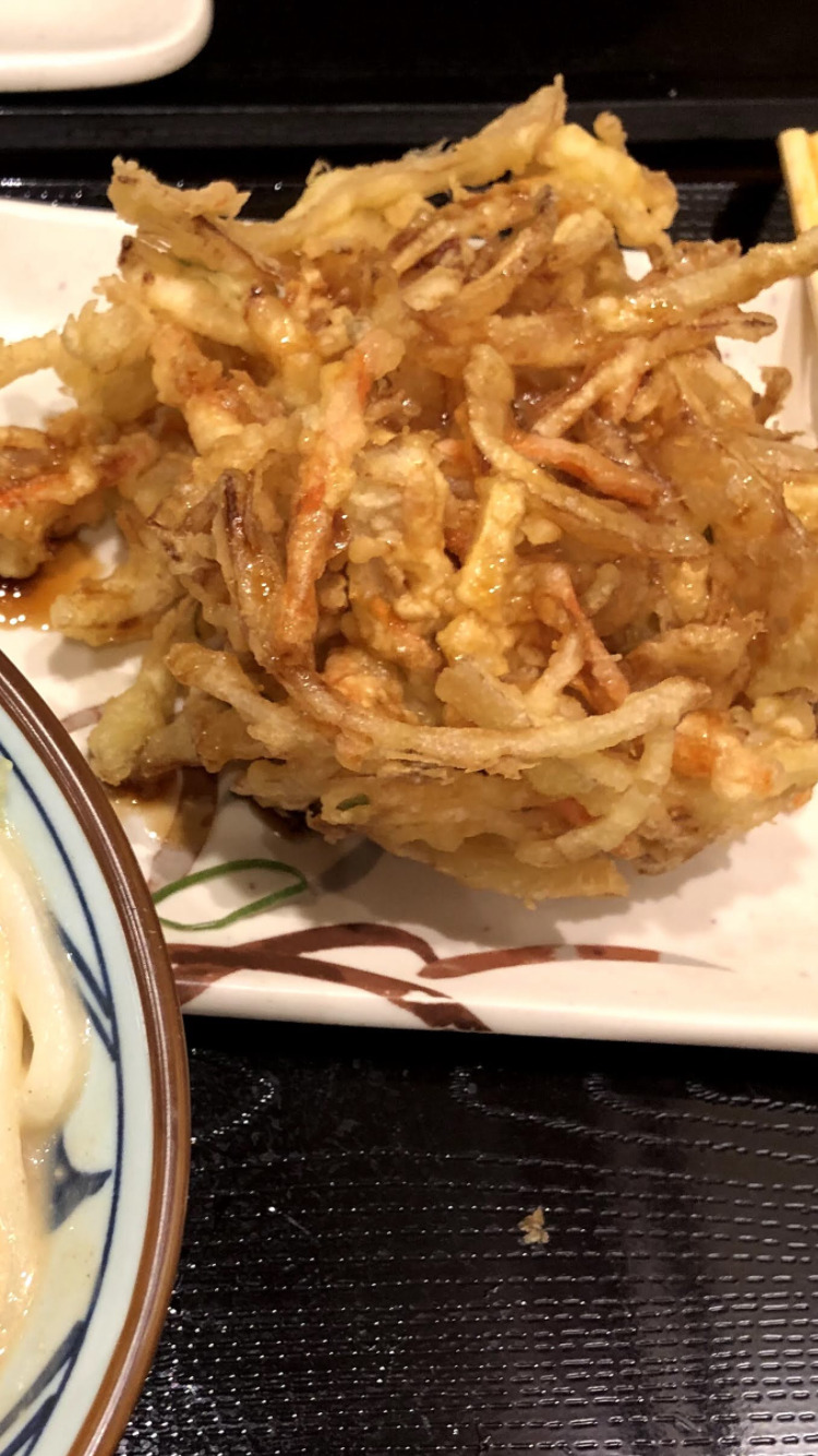 丸亀製麺のかき揚げは大きいから二人で1つ食べるのがちょうどいいかもしれません。