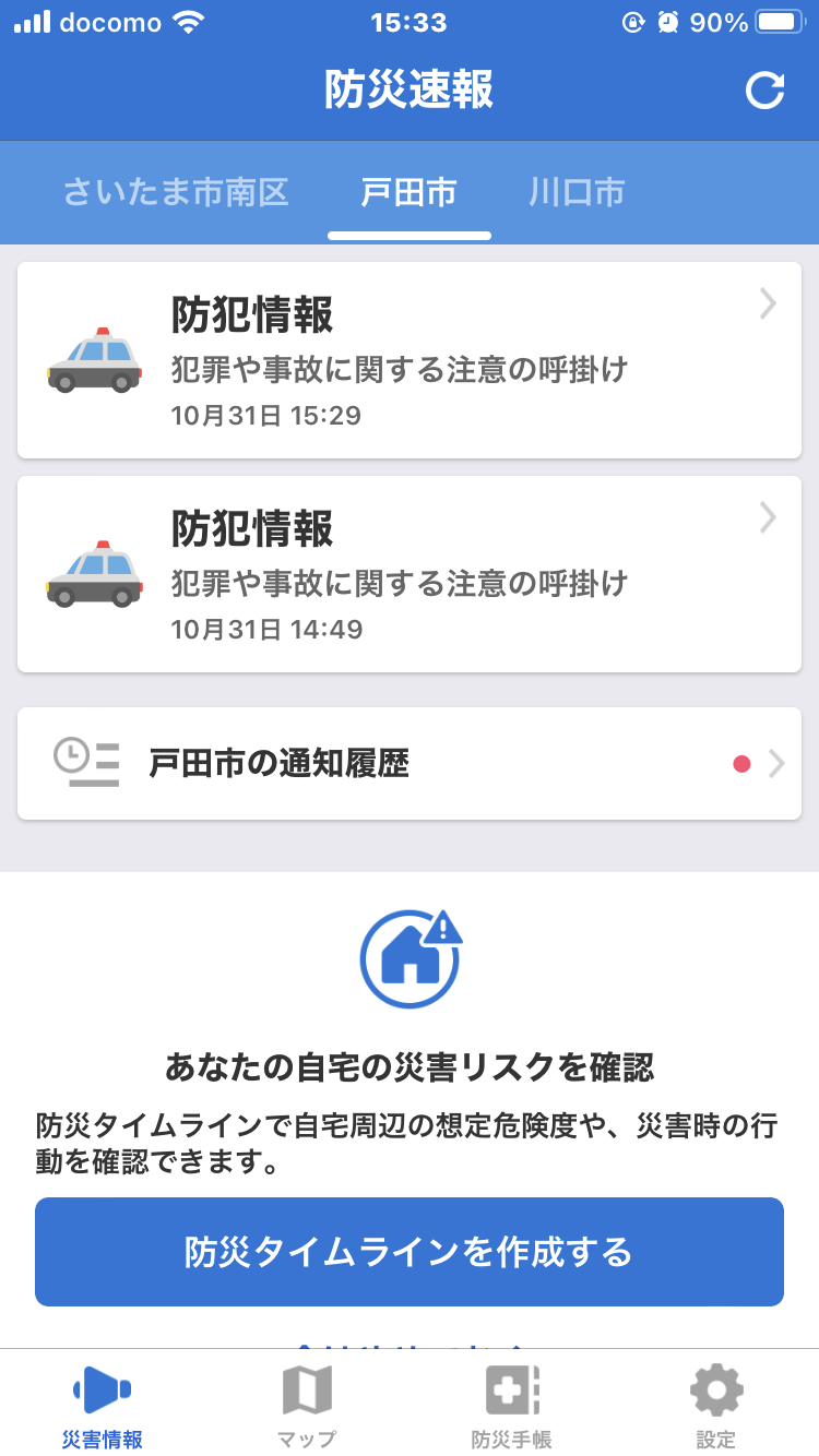 YAHOO JAPANの防災情報も入れて、地域を3つまで登録して情報を見ていますが、
