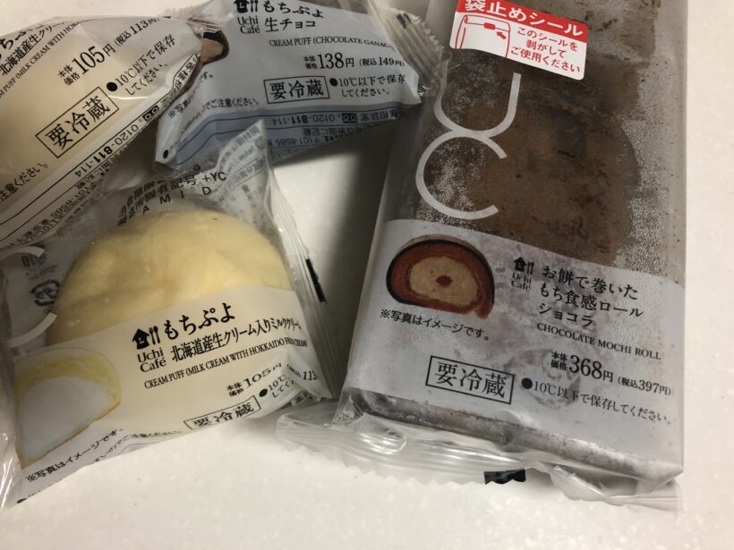 今回はローソンでもちぷよ北海道生クリーム入りミルククリーム105円ともちぷよ生チョコ138円とお餅で巻いたもち食感ロールショコラ368円を買いました。