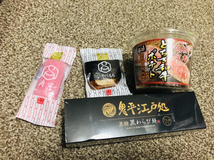とちぎ和牛ポテトや鬼平江戸処黒糖黒わらび餅やとちおとめの飲むヨーグルトなどを買いました。