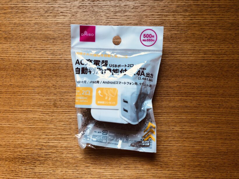今回は100均でAC充電器USB2ポートの自動判別付機能付の商品を買いました。