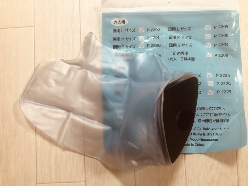 娘が指の骨を骨折してしまい、お風呂に入るときに包帯が濡れてしまうので、防水シャワーカバーを買いました。