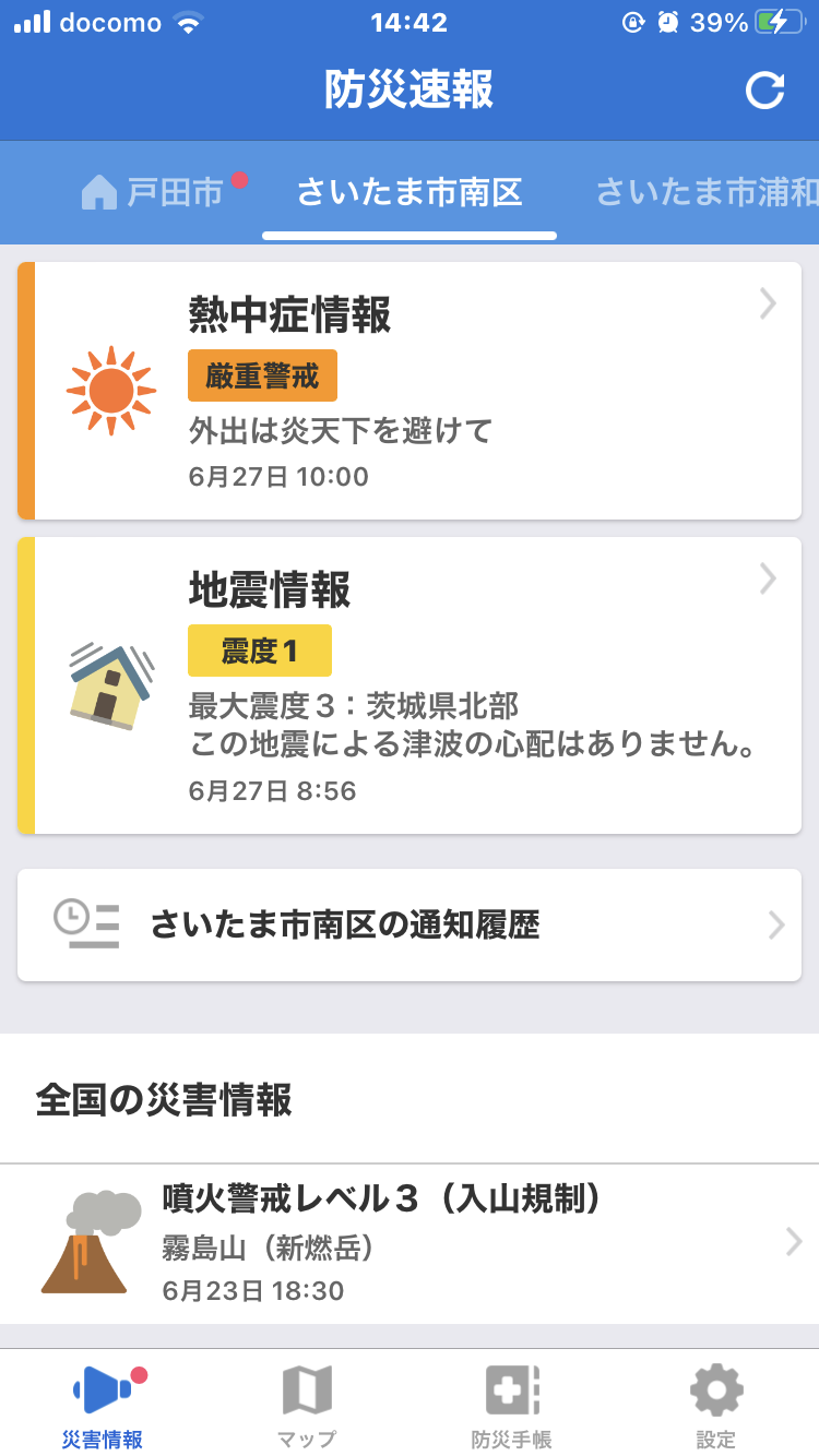 Yahooの防災情報のアプリを入れてますが、私が住むさいたま市は頻繁に防災情報が入ります。