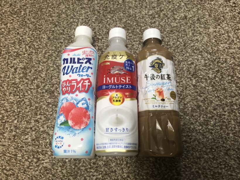 飽きてきた時は最近ハマっている、iMUSEヨーグルトテイストとカルピスWaterひんやりライチと午後の紅茶ミルクティーを交互によく飲んでいます。