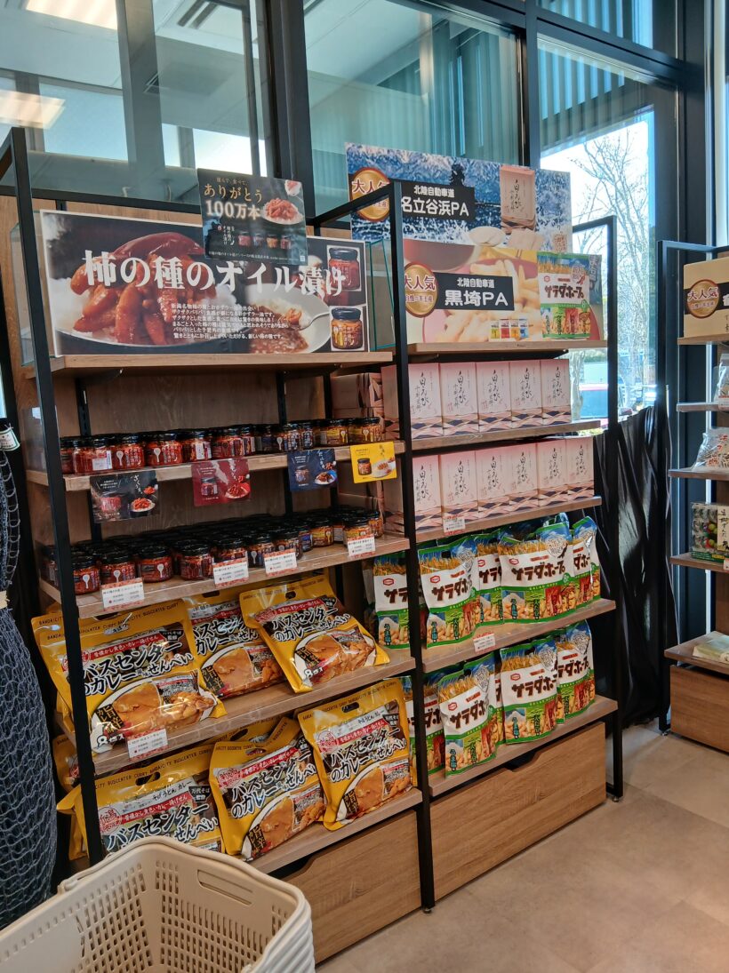 サラダホープと柿の種オイル付けやバスセンターのカレー風味せんべいなど売られていました。