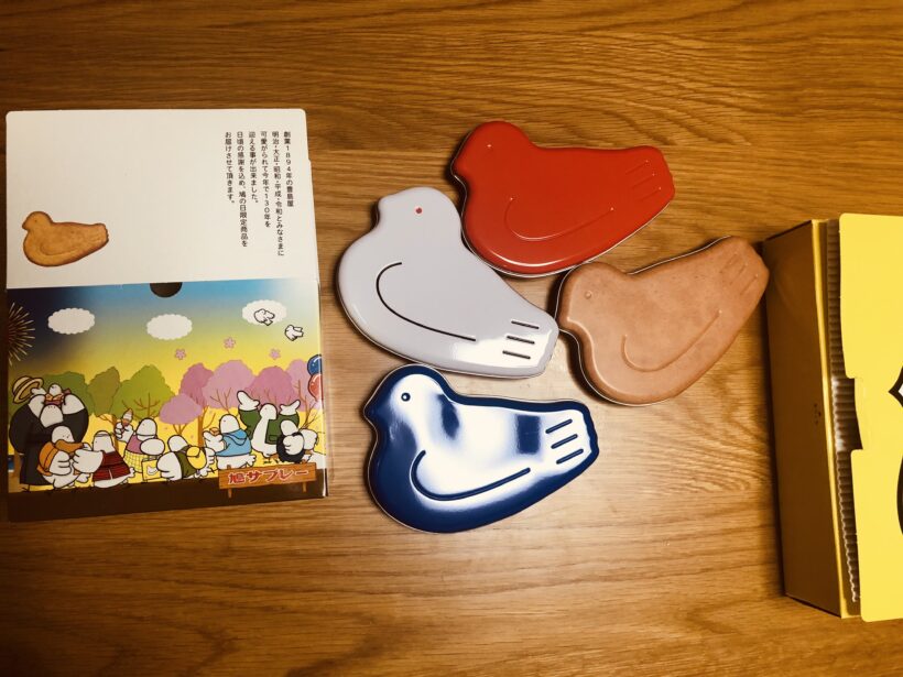 鳩サブレー色、青、白、赤の4色のかわいい缶でしたが・・・・。