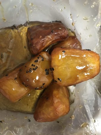 お土産用のきびだんごは、自分で茹でて、きな粉を付けて食べるんです。
