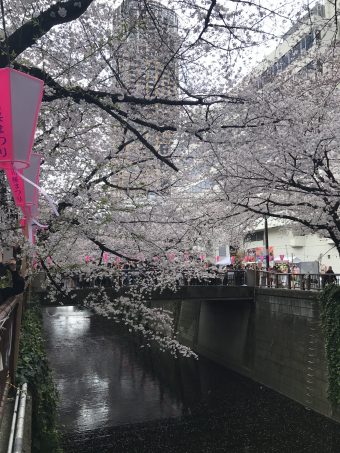 人が多く座ってゆっくり見ているようなところではありませんが、目黒川の両岸に咲く桜は圧巻です。