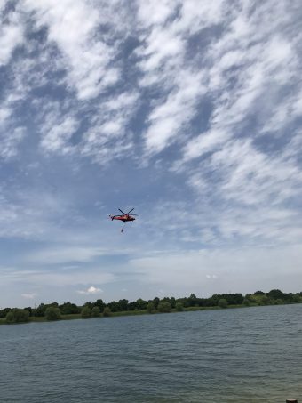 ヘリコプターの音がうるさいので見に行くと、水上救助訓練をしていました。