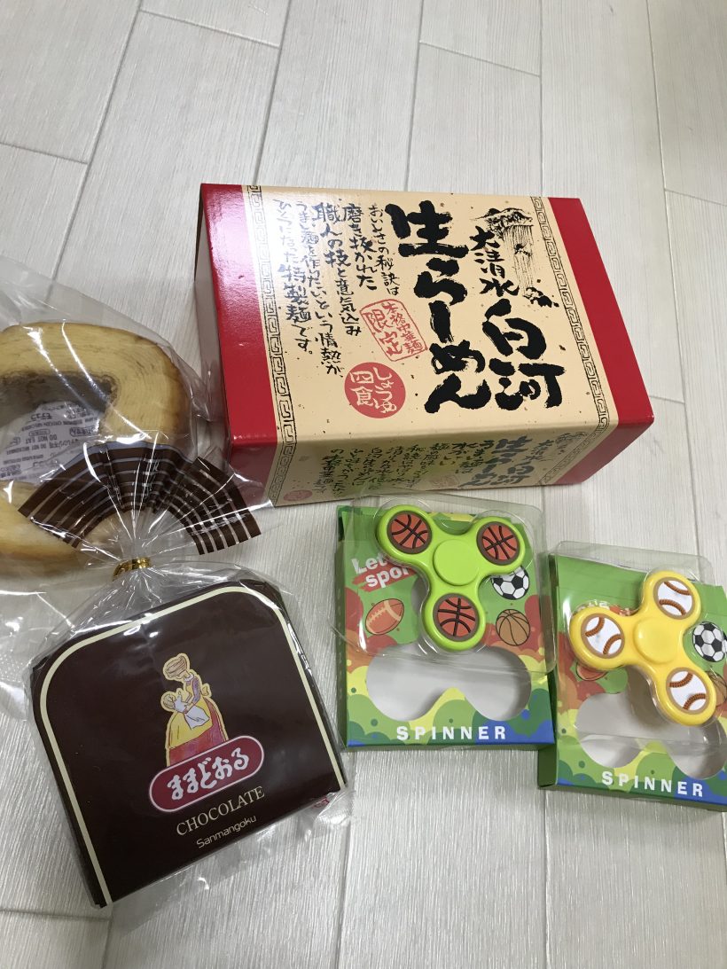 冬限定チョコママドールとハンドスピナーと白河ラーメンをお土産に買いました。