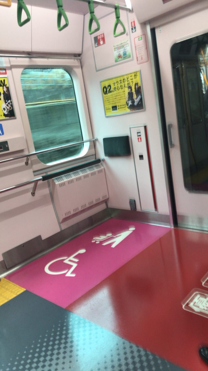 床がピンク色、ポールがオレンジ色になっているのは、優先席の部分だけなんです。