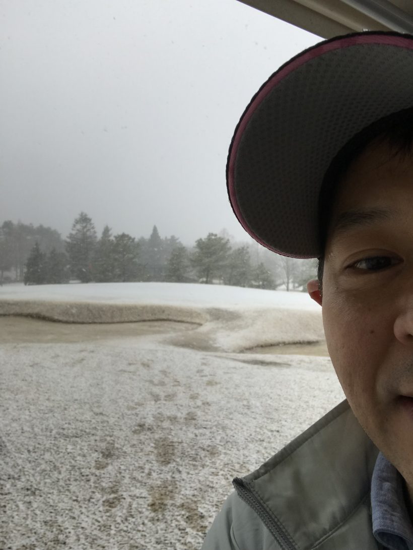 アウト4ホールを終えた頃はグリーンに雪が降り積もり、グリーンの芝の緑が真っ白になってきました。