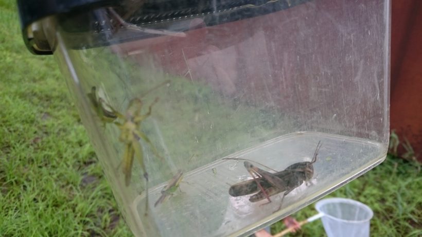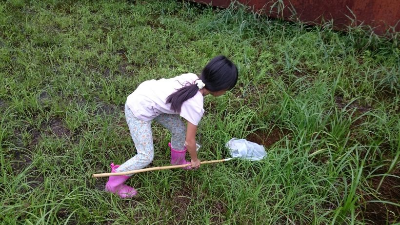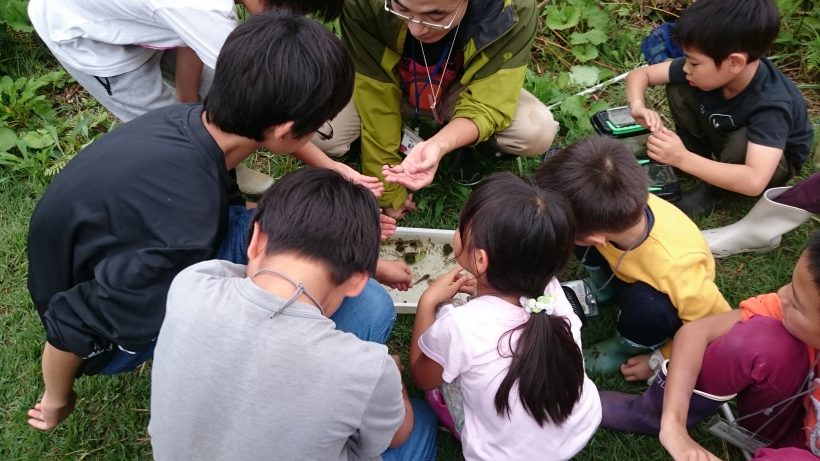 男の子たちに負けずにバッタやカエル、ヒル(!)を手に取る娘氏。