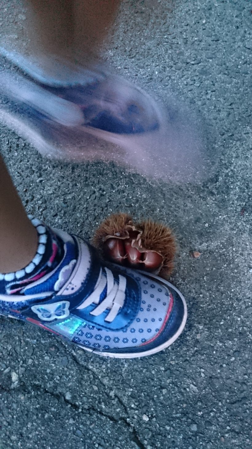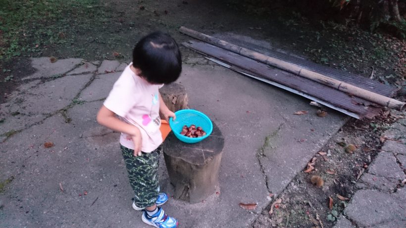 やり方を教わり、足を使って器用に栗を取り出していました。