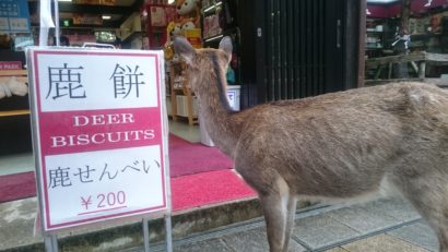 店の前で、鹿せんべいを買った客を待ち受ける鹿の姿も。