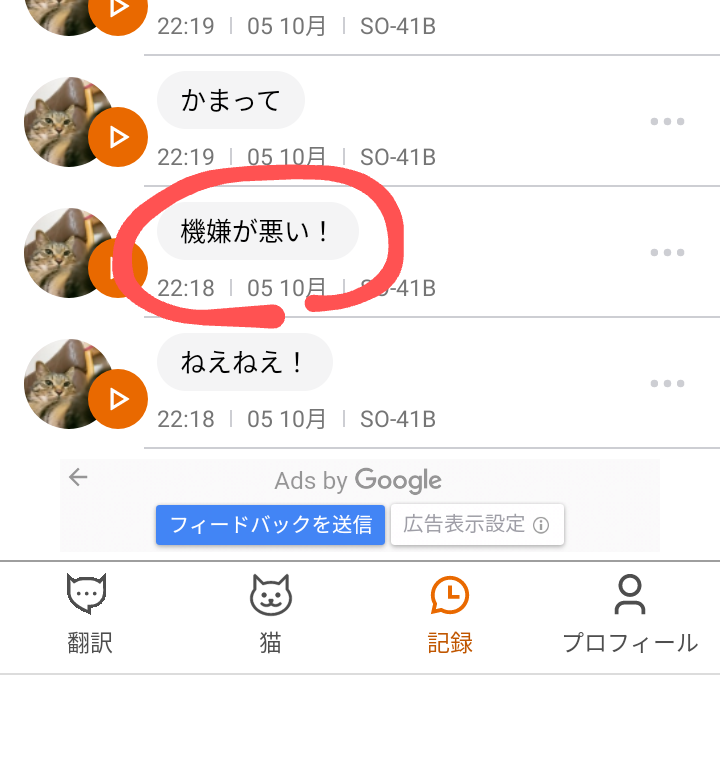 そんなお猫様に猫語翻訳アプリ「ニャントーク」を使った結果がこちら。