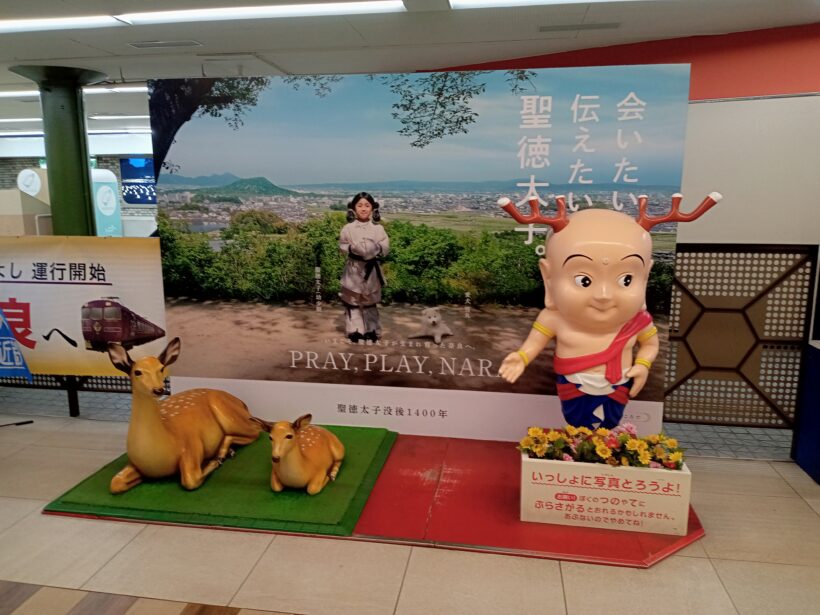 奈良駅。鹿とせんとくんの奈良2大巨頭がお出迎え