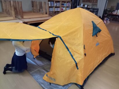 さすがにキャンプ初心者&子連れに、この時期の新潟の屋外は厳しいということで、テントは暖房のついた屋内に設置。