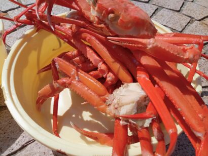 みなさん海辺にて一心不乱にカニを頬張る頬張る。