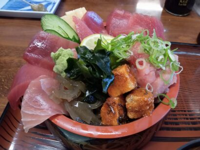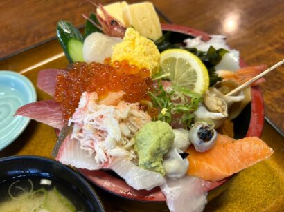 佐渡島の南西にある「長浜荘」で自慢の海鮮丼をいただきます。