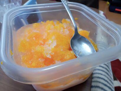 作り方は缶詰のミカンをタッパに入れて冷凍庫で凍らせるだけ。