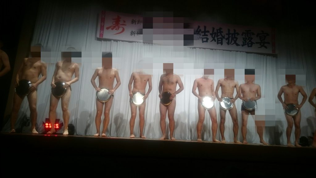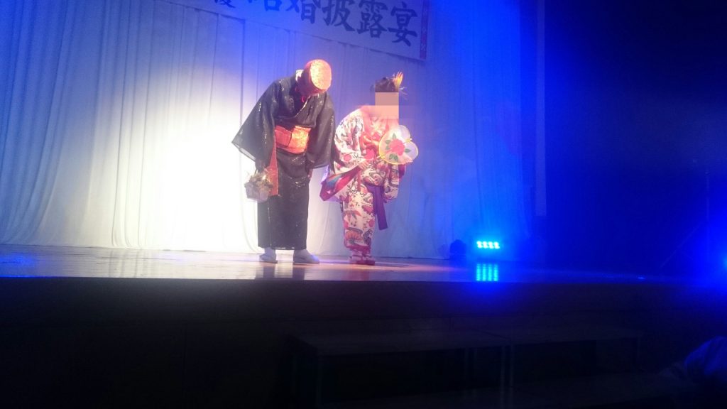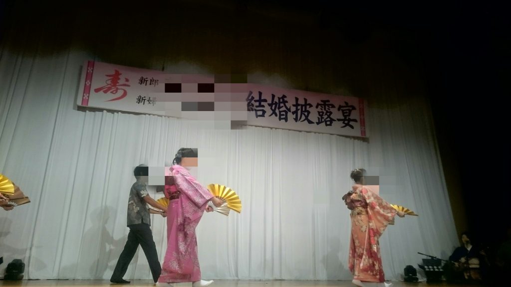 そして余興が盛り沢山。新婦新婦の席の他にちゃんと舞台があり、垂れ幕どーん!