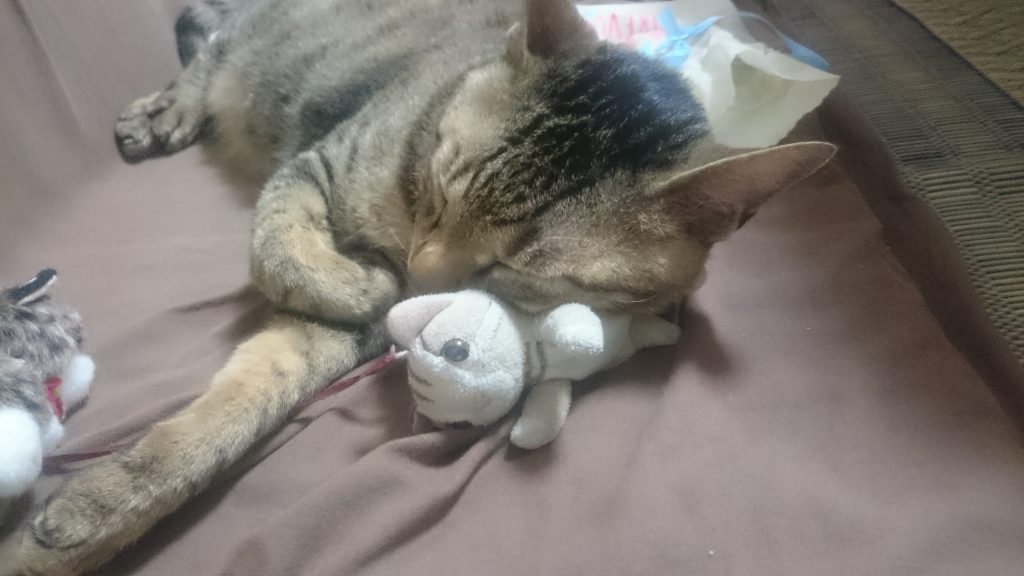 それでは「猫のぬいぐるみを枕にする猫」の画像で本日はお開き。