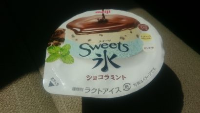 セブン&アイ限定「明治 Sweets氷 ショコラミント」156円(税込168円)とろ~りチョコソース、チョコクッキー入りミントアイス、ミント氷を重ねた3層構造☆
