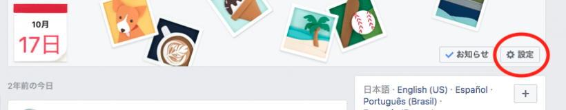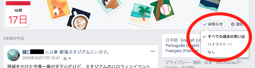 「過去のこの日」が表示されるので、右端の「お知らせ」をクリック。