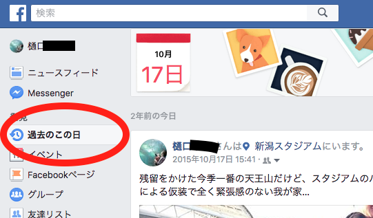 パソコンではFacebook左のツールバーから「過去のこの日」をクリック。