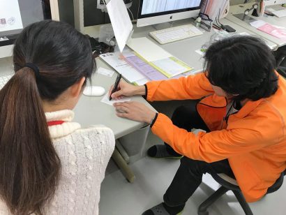 こちらはヒグチのデザイン説明の後、F山次長が名刺作成についての説明をしている様子ですね。忙しい日だったので、後半はイケメン次長にバトンタッチしたのでした。
