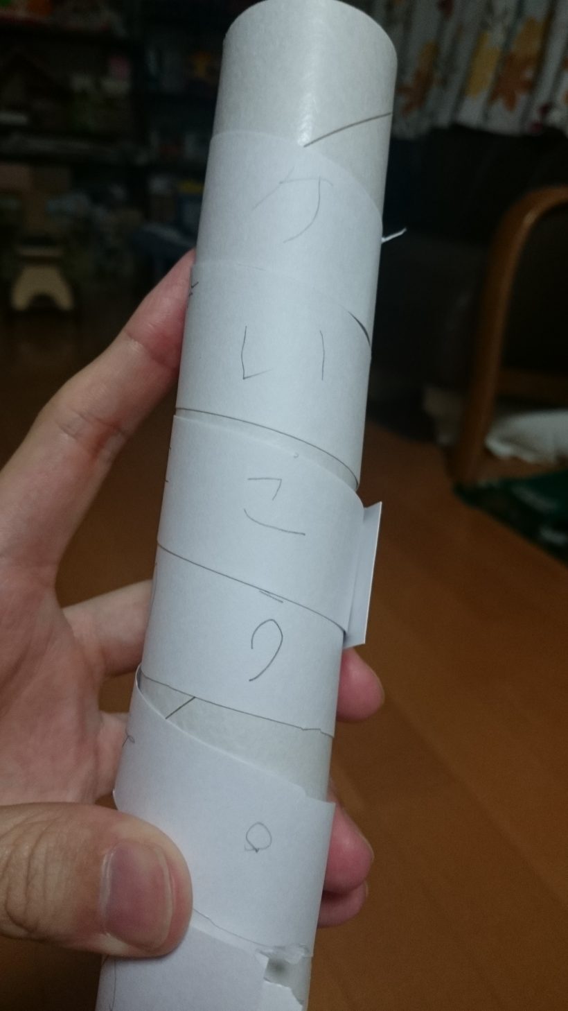紙切れにはよく見ると文字が書いてありますが、横に読んでみても意味不明です。