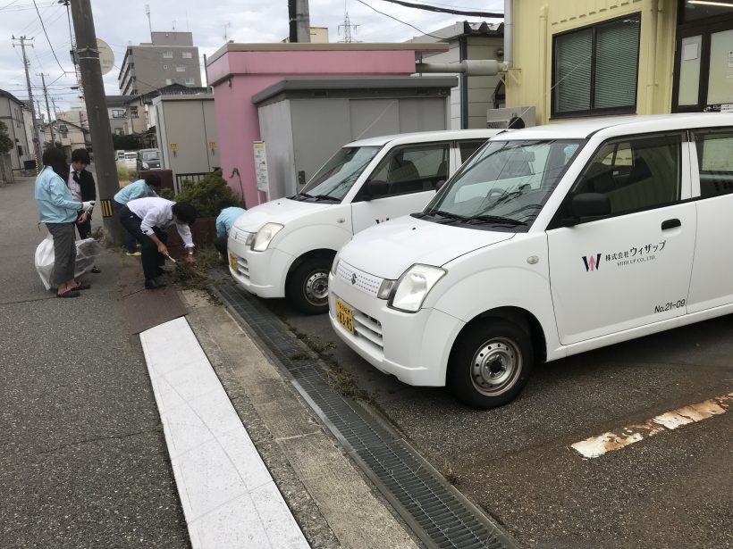 会社の周りの草が生い茂っているということで各部署もちまわりで草取り。