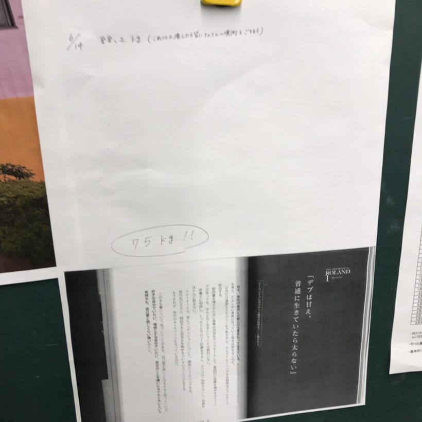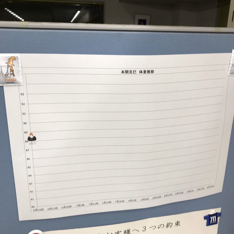 本日の営業の朝礼で部下のダドリーがおもむろにダイエット宣言。毎週金曜の朝礼で自分の体重を報告するらしい。目標は来年の健康診断(4月)で75kg。応援してるぜ!#88kg #目標まで13kg #ROLANDのデブは甘えとかつらたん pic.twitter.com/VrJB1ElWfM