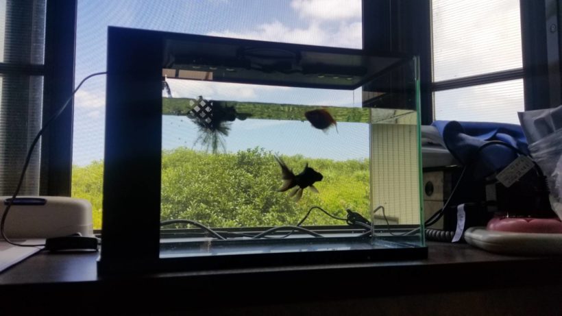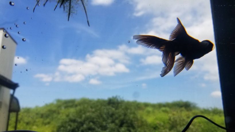 さっそく出窓に水槽を置き、水をいれ、金魚を入れてみた。