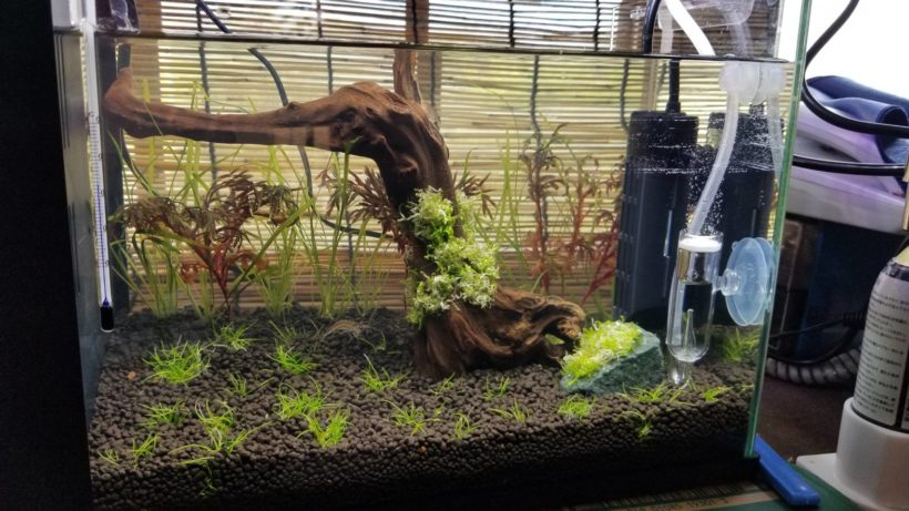 流木と石を買い、そこに水草のリシアを巻き付け、そして絨毯でひいていたラージパールグラスからヘアーグラスに変えました。