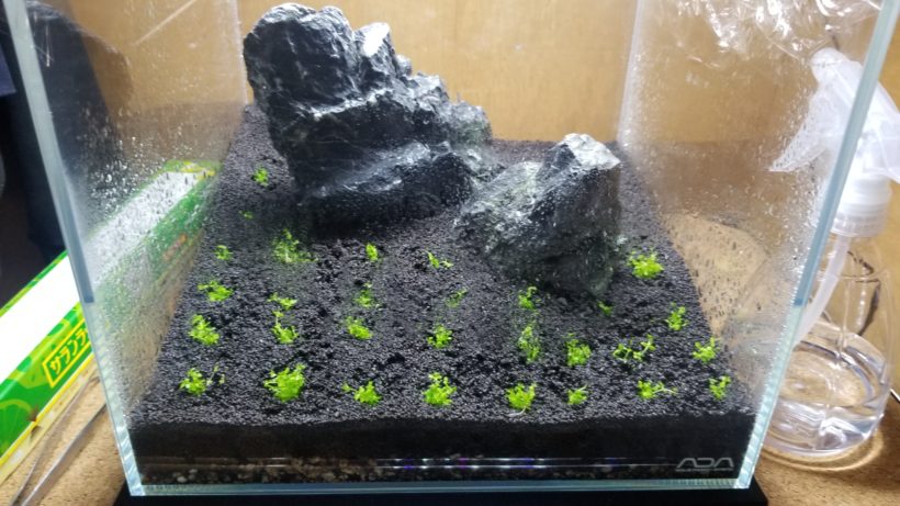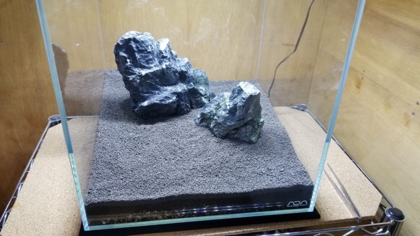 ミスト式水槽を立ち上げることにして、底床を完成させいよいよレイアウトの部分。