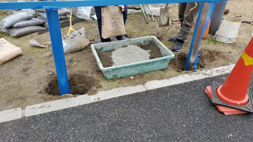 設置場所に約1mの穴を掘りそこに看板の脚を埋め込みます。