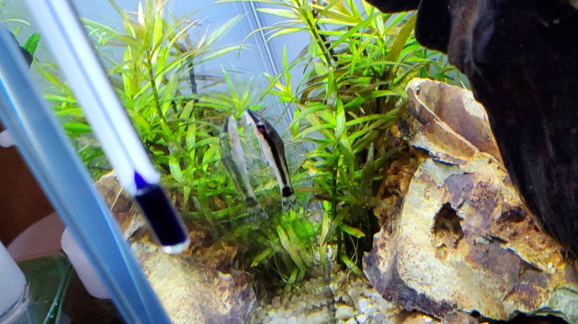 たまーにライトをつけたときはびっくりして泳ぎまわりますが、基本的にはガラスや水草、流木に貼りついてます。