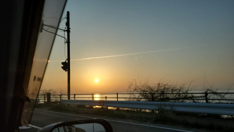 この前の夕日。自分におつかれと言っているように日本海に沈みそうな夕日がとてもきれいでした。