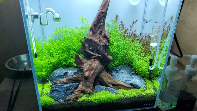 二酸化炭素のスイッチが入って、ライトがつくと全体で光合成して酸素の気泡を出す水景は最高にきれいです。