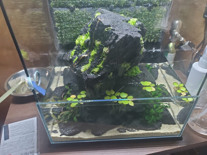 レイアウトのイメージとしては、山水石の黒と底床の白いラプラタサンドでメリハリをつけつつ、ウォーターローンの緑と山水石の黒の調和で和な感じを出してみました。