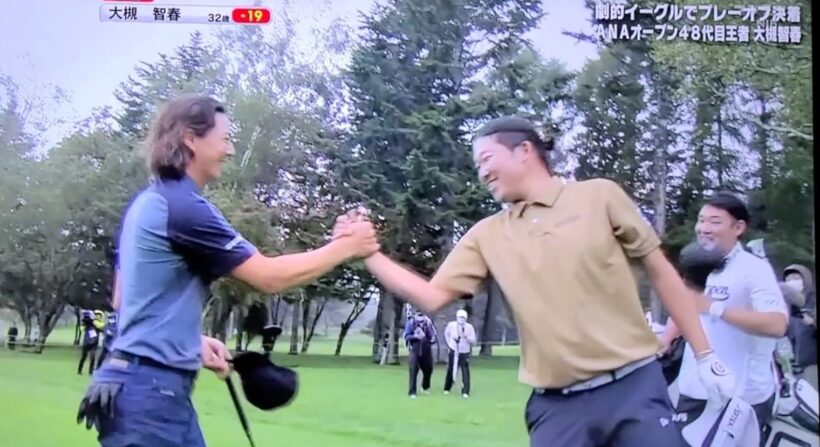 石川遼プロと大槻智春プロが-19で並び、プレーオフで決着をつけるという展開に。